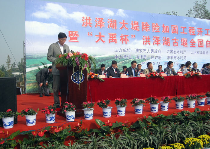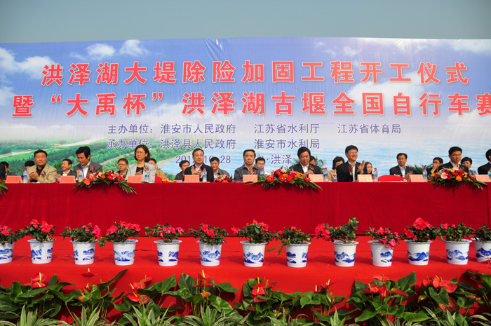 10月28日上午,洪泽湖大堤除险加固工程开工仪式在风景如画的洪泽湖畔隆重举行。水利部淮河水利委员会副主任刘玉年出席仪式并致辞,省水利厅厅长吕振霖、副厅长李亚平及淮安市委等领导出席了开工典礼。我公司董事长朱学林在仪式上发言。