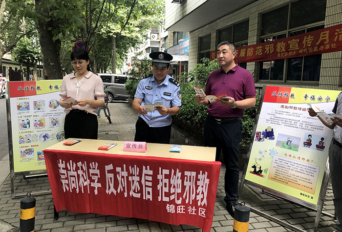 714日上午,天气闷热,蝉鸣刺耳,扬州市梅岭街道办锦旺社区“深入开展防范邪教宣传月活动”来到公司大院,给公司广大员工送来了法制知识和文明“凉风”。