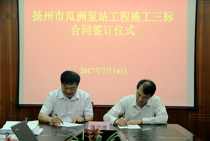 714日下午,扬州市瓜州泵站主体工程合同签订仪式在扬州市水利局举行,扬州市水利局副局长凌国栋、瓜洲泵站建设处相关领导、中标单位代表出席了签订仪式。公司董事长时爱祥参加活动并签订合同。