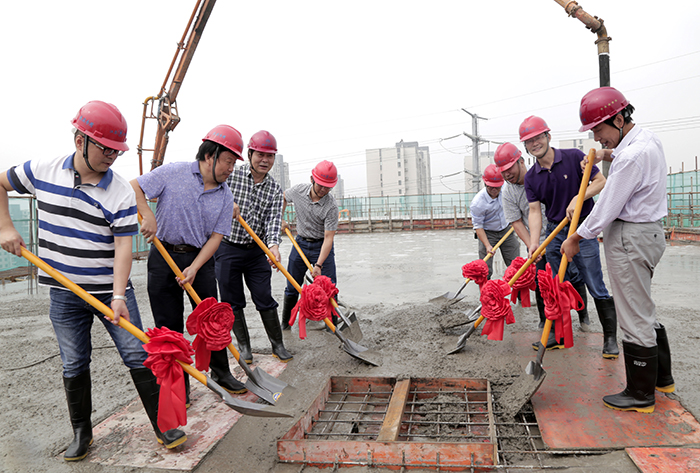 上午958分,随着最后一方混凝土从泵管流下,水建公司、水机公司在场的领导一起挥锹,为大楼封顶。这是继96日金加工车间、2#5#加工车间顺利通过钢结构主体验收,919日上午张爱军市长来新基地调研后新基地建设的又一大事。目前,新基地二期工程主体基本完成,进入设备安装、办公楼内外部装修装饰阶段。