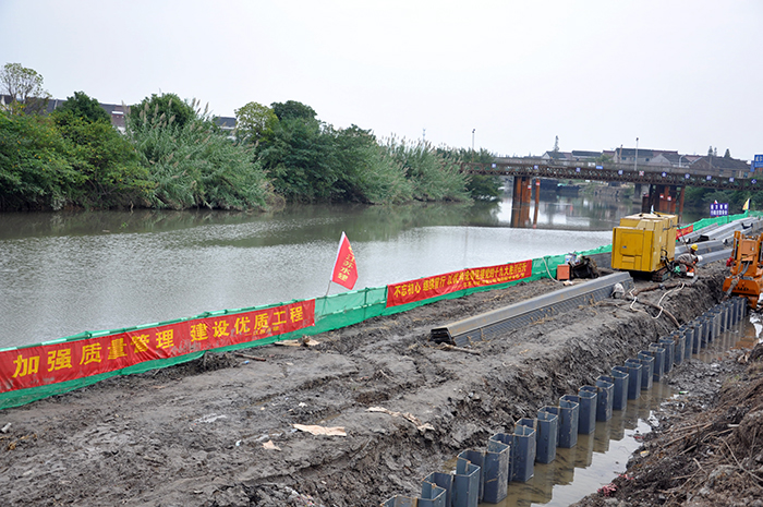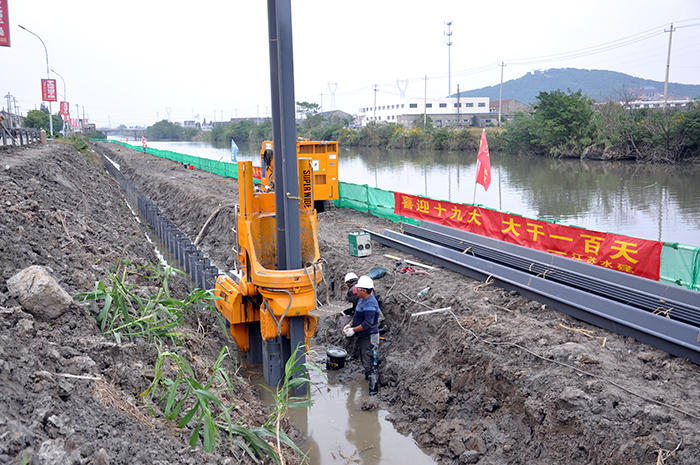 常州新沟河V标项目全长4750米,全部采用锚拉式钢板桩护岸结构型式,共需要U600冷弯钢板桩8000吨、锚索2200根,采用的囊式扩大头锚索、静压植桩工艺区别于传统施工工艺,具有环保性、安全性、快速性、经济性、文化性五大特点。不仅提高了施工精度和效率,更贯彻落实了高标准环保的要求。工程施工无振动、无噪音,影响范围极小,有效降低了环境负荷,符合我国的经济发展趋势,积极响应了十九大加强生态文明建设的号召。