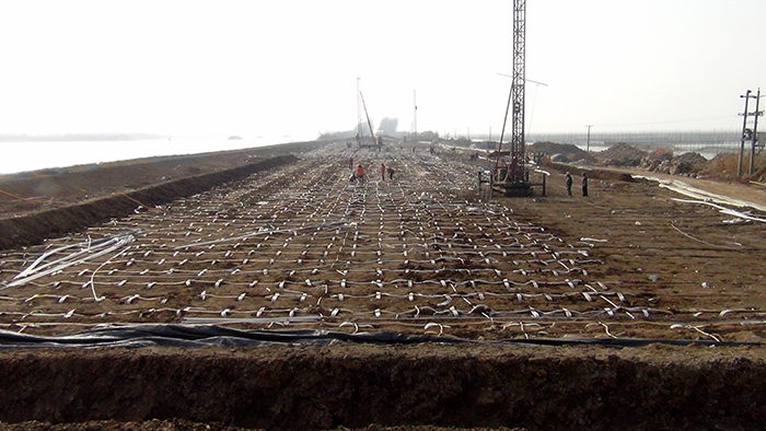 淮河入江水道整治工程运河西堤崇湾段为历史险工段,淤土层厚度大、含水率高、强度低,堤身逐年下沉,不能保证行洪安全,危及淮河下游人民生命财产安全,被列为整个工程的重点内容。公司项目部与建设、设计等单位开展技术攻关,引入微劈裂系统,成功实施了堤防深层淤土地基变真空预压排水加固施工,取得了较好的社会和经济效益。