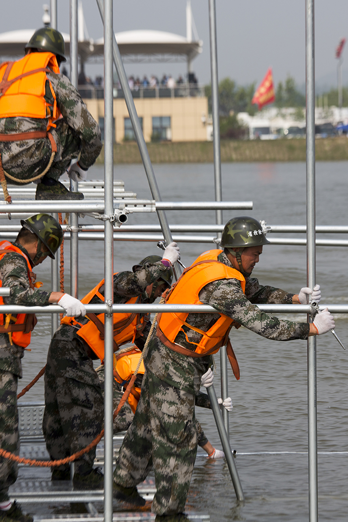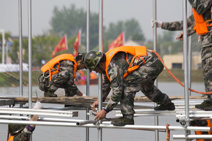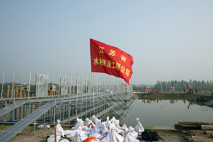 公司的参演队员均来自扬州市重点工程瓜洲泵站工地,技术熟练,业务精湛。他们用不到30分钟的时间,迅速搭起了组合坝的脚手支撑系统,成功封堵了溃坝决口。下面是他们演练过程的精彩回放: