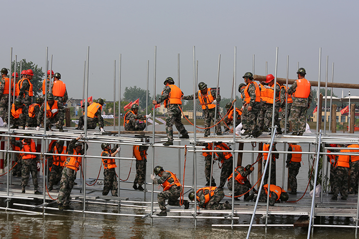 “是!江苏水建防汛抢险突击队立即开展钢木土石组合坝搭建作业!”