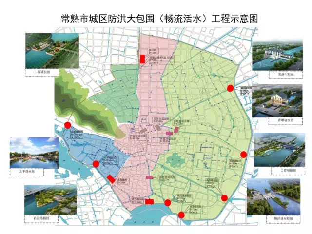 常熟市城区防洪大包围工程是根据常熟市防洪排涝的总体布局,结合城区畅流活水项目建设,按照防洪100年一遇、排涝20年一遇的标准,新建常浒河枢纽、青墩塘枢纽、白茆塘枢纽、肖泾港闸站、横泾塘东闸站、横泾塘西闸、元和塘闸、太平港闸站、山前塘闸站、陈泾闸等10处控制性建筑物,与已经建成的南福山塘冲污站、耿泾塘南闸、宅前塘闸站一起,形成城区防洪大包围圈。通过科学调度、精细调控,进一步提高城区防洪排涝能力,改善水环境质量。