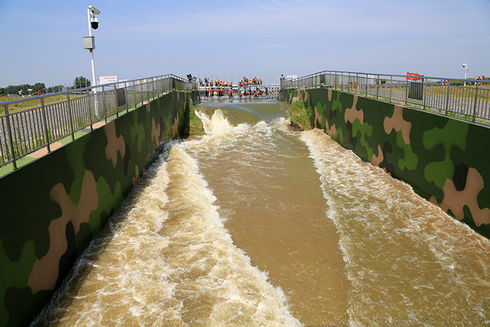 汹涌的水流冲破堤坝直泄而来,虽然是演习预设场景,但水流的冲击力不亚于真实的决堤抢险。公司的队员立即行动起来,植桩机拉起钢板桩,随着一阵阵锤击声,钢板桩迅速插向决口,决口逐渐缩小。十多分钟后,一道坚固的钢板桩围堰拦阻住了肆虐的水流,决口封堵取得了圆满的成功。