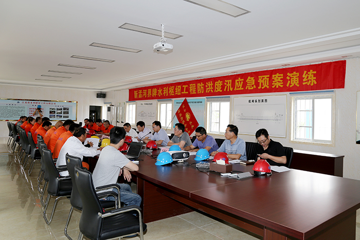 演练场景模拟汛期新孟河延伸拓浚界牌水利枢纽工程施工场区突遭强降雨天气,造成施工场区集水过快,闸塘基坑出现积水,降水井和五七灌排泵站排水能力不足,危及闸塘基坑安全。防汛领导小组立即启动防汛应急预案,通知抢险队前往救援。