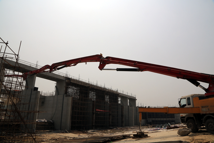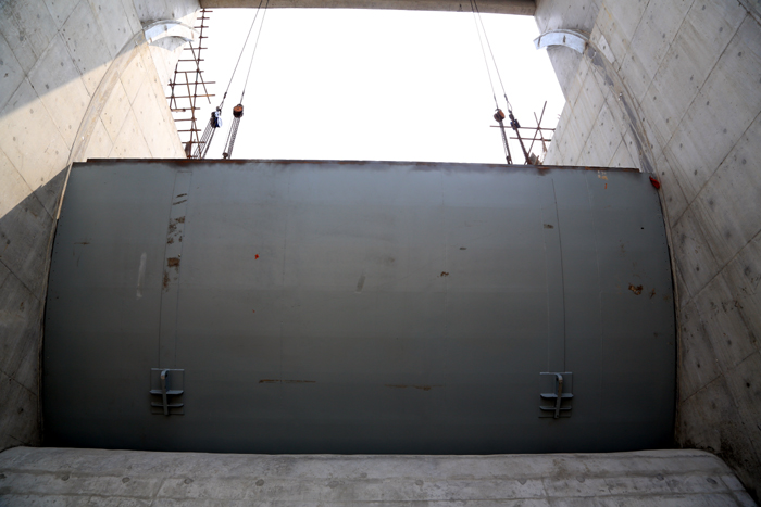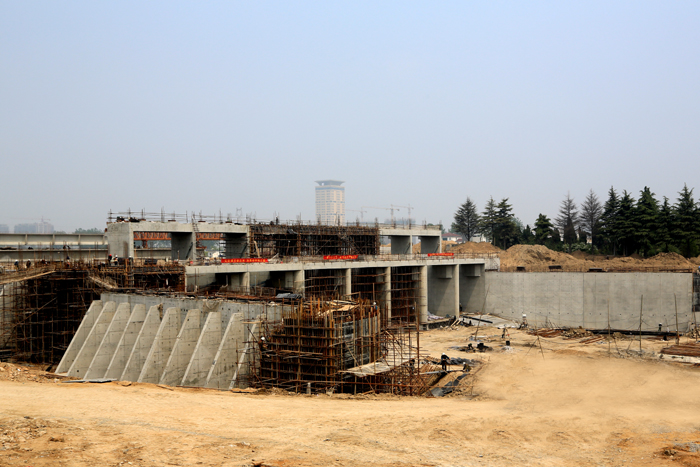 425,在“五一劳动节”到来前夕,记者来到泗阳节制闸除险加固工程施工现场,当时就有1#孔滚水堰、水电站第三层、下游护坡等三处进行混凝土浇筑;走上节制闸早已贯通的交通桥桥面上,伫立凝望:远处更多的护坡、护坦、消力池部位,工人们在开挖土方,铲坡立模,绑扎钢筋,为着尽快浇筑混凝土做着准备;闸室里,闸门起吊、就位、焊接拼装,忙而有序;节制闸上下游两侧的四个螃蟹爪子,四块翼墙正在绑扎钢筋、立模、浇筑,工人们在如蛛网密布的脚手架、钢筋上穿梭忙碌着……“我们正在跟时间赛跑,距‘531’水下工程验收还有一个月时间,我们一定要咬紧牙关,向着目标全力冲刺。”项目经理李新海告诉记者。