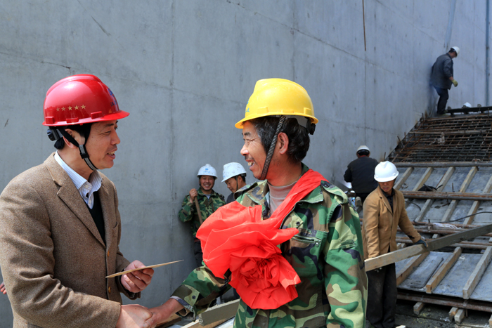 表彰一线优秀员工(项目部开展了劳动竞赛评选优秀职工活动,3月份表彰了左立固(木工组长)、郭勤来(钢筋工组长)、范育伟(水石队工人)等3名农民工兄弟。图为公司朱学林董事长在工地现场为水石队工人范育伟披红花,发奖金。范育伟默默无闻、勤勤恳恳,因身着迷彩服,不知疲倦地埋头做事,人称“迷彩哥”,直至表彰时大家才知道他的名字。)