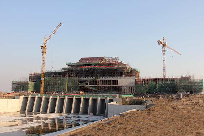 瓜洲泵站主厂房总高 28.5 米,为晚唐设计风格,既考虑了泵站的功能需要,又突显了扬州古城的建筑风貌。泵站主厂房建筑物高大,采用古典结构,其纵横交错、大小不等的屋梁,远远伸出的屋檐,富有弹性的屋檐曲线,微微起翘的屋角,给施工增加了极大难度。江苏水建公司项目部的施工人员克服重重困难,发挥在大型泵站工程建设中的技术优势,全力开展技术攻关,抓质量保进度,于2019年元旦期间完成了立模、扎筋工作,迎来了主厂房封顶施工的重要节点。