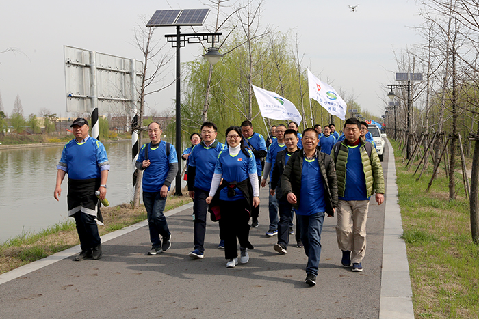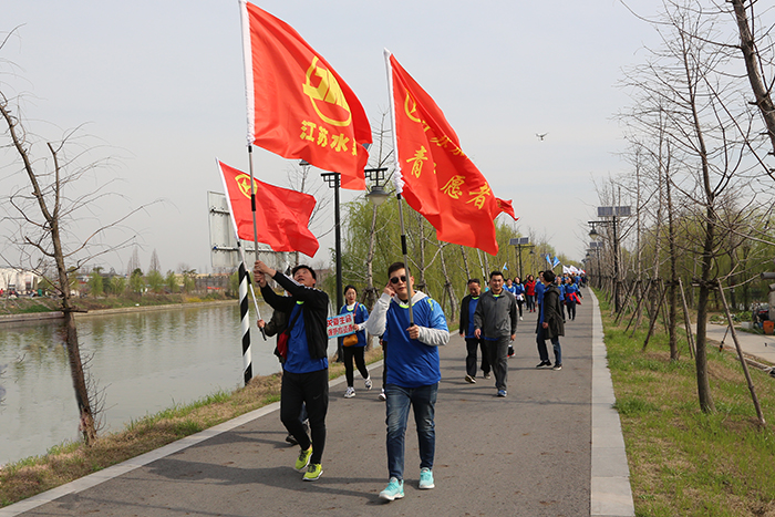 在古运河东堤7公里多的徒步路上,一侧是碧波清水,杨柳依依,一侧是麦苗青青,菜花飘香。大家高举着旗帜和宣传标牌,一路欢声笑语。或步伐矫健,大步前行;或成群结伴,指点河川;或驻足留盼,记录美景。此时此刻,大家呼吸着大自然清新的空气,欣赏着古运河边的盎然春色,身心俱佳,惬意无限。
