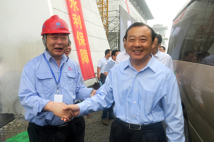 6月26日上午,由我公司承建的扬州城市安全第一工程、“清水活水、不淹不涝”城市标志性工程——瓜洲泵站正式投入使用。从此,活水润城,江河安澜。市委书记谢正义、市长夏心旻、市政协主席陈扬出席启用仪式,并与水利系统老领导、老专家共同推杆启用瓜洲泵站。李航、陈锴竑、王炳松、吴广晶、韩骅等市四套班子领导参加活动。