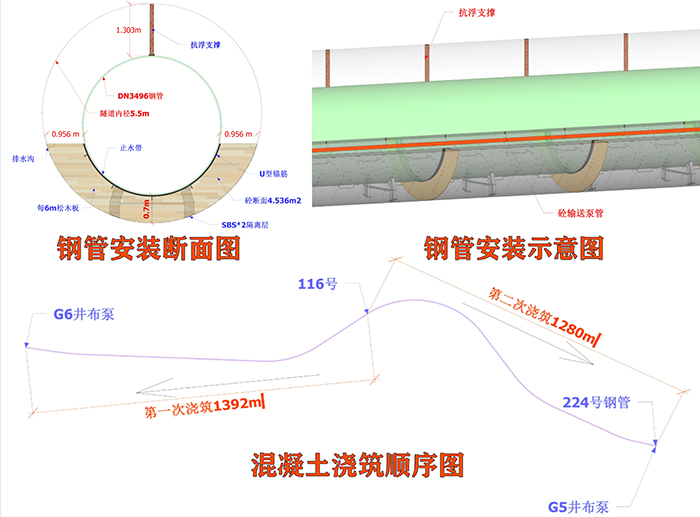 超远距离混凝土浇筑是本工程施工的又一难点。钢管进入隧道后,混凝土材料及浇筑设备无法进入隧道,无法用传统“接力泵送”的方式输送混凝土,前期准备的模板、钢筋、泵管等全部工作,只能通过隧道与钢管间不到一米的狭窄通道,通过人海战术手拎肩扛完成。隧道中间无任何缺口,无论从隧道哪一端的工作井浇筑,混凝土输送距离都接近1400米。项目部多方比选方案,最终采用了目前国内市场动力最大的柴油地泵。该地泵额定水平泵送距离800米,项目部从混凝土配比到泵管布设等各个环节精心组织,全面细化,完成了隧道中部1400米超远水平距离泵送混凝土浇筑,且一次成功,创下了公司超远距离混凝土浇筑的新记录,为公司今后类似工程积累了宝贵的施工经验。