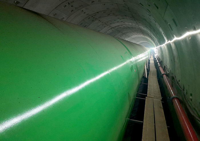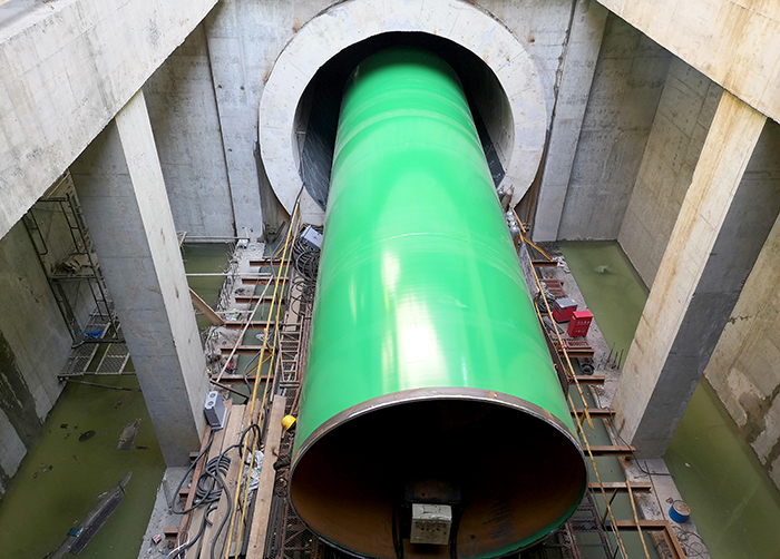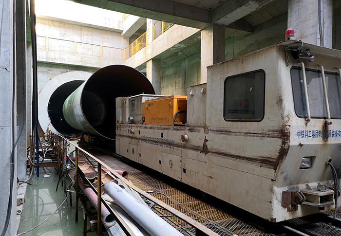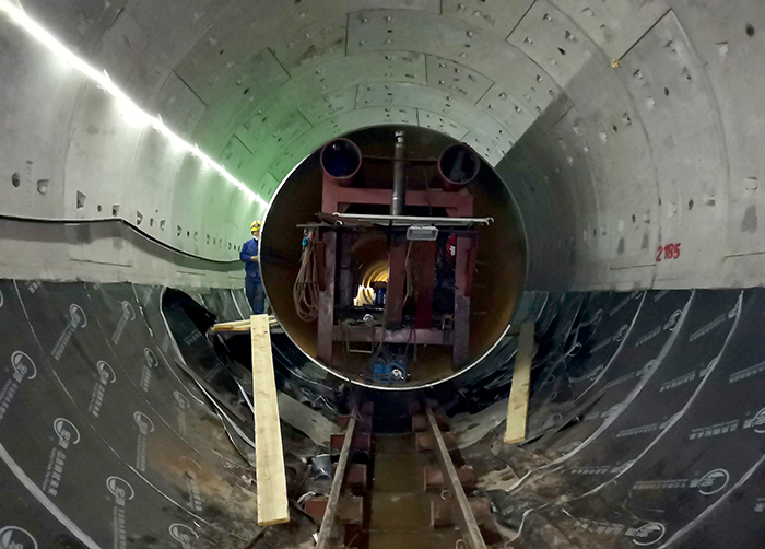施工过程中遇到了诸多难以想像的困难——工程要在受限的隧道空间进行重达31吨的钢管运输安装,常规施工设备根本无法施展;项目部人员缺少隧道施工经验,缺少专业施工设备,没有现成的施工方法借鉴。在公司强有力的支持下,项目部技术人员广开思路,开展技术攻关。他们对大口径钢管运输、对口等设备进行创新设计,并不断进行优化改进,确保了钢管安装的顺利推进。
