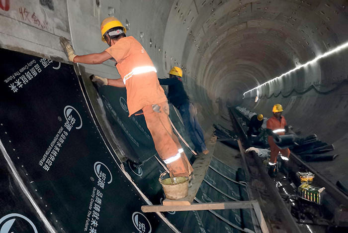 工人在隧道内铺设SBS防水材料