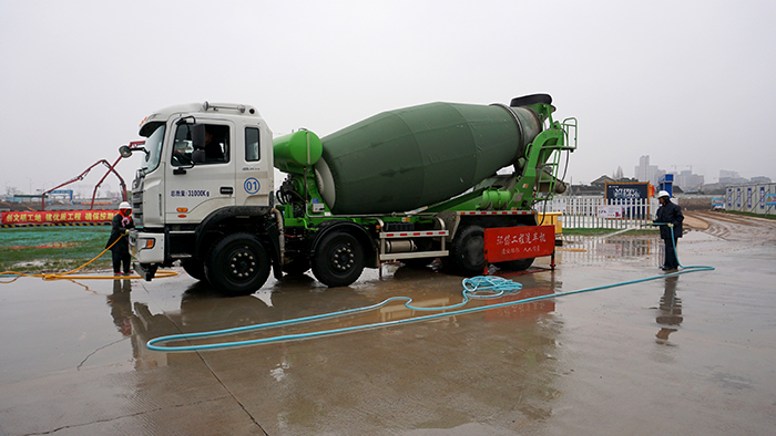 此次浇筑为定波枢纽开工以来最大体量混凝土浇筑,累计浇筑方量2858m3,历时25小时左右,采用三泵车、大容量混凝土运输车不间断浇筑。为保证大体积混凝土浇筑顺利完成,项目部进行了详细部署和安排,确保连续施工无隐患,现场施工无风险。浇筑前,项目部邀请了无锡市水利局、江阴市水利局质量安全监督站现场进行检查,对所有作业人员及技术人员进行专项安全生产技术交底,明确人员分工、振捣要求和平整度控制标准。浇筑时,管理人员在施工现场、混凝土厂家值班,工人对出场运输车辆进行冲洗。