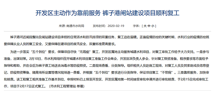 为保障项目尽快“无瑕疵”复工,南通市水利局、开发区建设局对复工工作给予大力支持。一是参与准备,出谋划策。针对复工物资准备、程序要求等方面给予指导和帮助,为工地送来口罩、消毒水等防疫物资。二是现场查看,分类指导。相关领导赴施工现场,对复工人员及其家庭成员信息登记、防疫物资筹备、隔离场所设置等情况现场逐一查看,并根据五个到位要求进行分类指导,保证项目复工不带病。三是靠前服务,加快审批核查。本工程复工相关准备工作到位,申报材料上报至开发区后,开发区第一时间接受审批申请并进行审批核查,于215日完成审批工作,216日工人到工,217日正式复工。