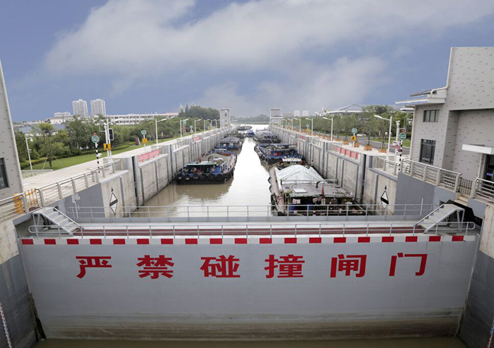芒稻船闸位于芒稻河航道入江口门处,是控制芒稻河航道货物流量的重要节点。改造后的芒稻船闸为III级通航建筑物,设计最大船型为1000吨级船舶。工程主要包括芒稻船闸扩容改造工程上下闸首横拉门、阀门及运转件、横拉门启闭机、止水的制作等。工程自2015年12月开工,2017年11月20日通过竣工资料档案验收。