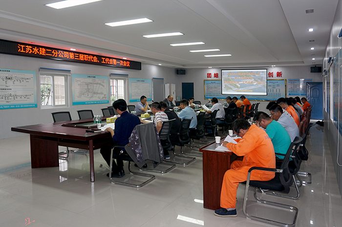 6月11日下午,第一工程分公司在扬州市长江堤防加固二期工程广陵区Ⅰ标段项目部召开了三届一次“职代会、工代会”,公司领导顾明如、姜启生、翟高明、工会副主席李娟和分公司32名职工代表参加会议。