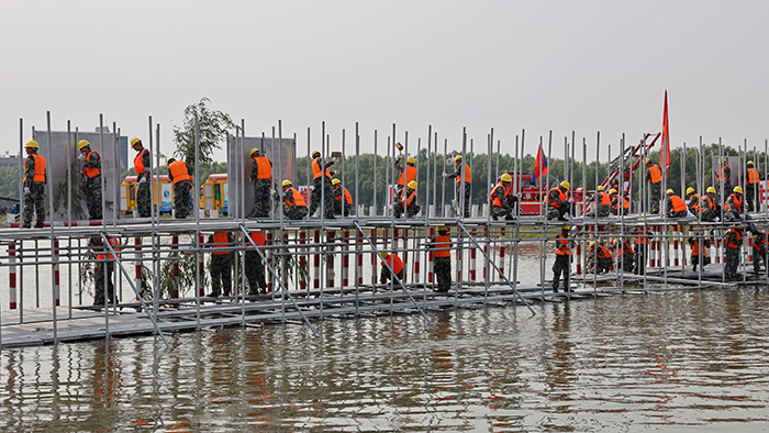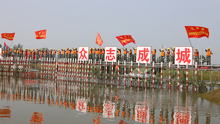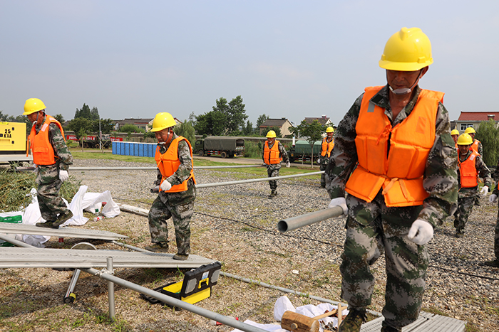我公司参演科目为搭建钢木土石组合坝封堵决口。一分公司抽调了30名精干熟练的技术工人组成演练队伍,由瓜洲泵站项目部工程技术科单国威任领队。顾明如董事长要求参演队员充分发挥专业特长,全力以赴,认真参演,展现过硬的素质和良好的精神风貌。