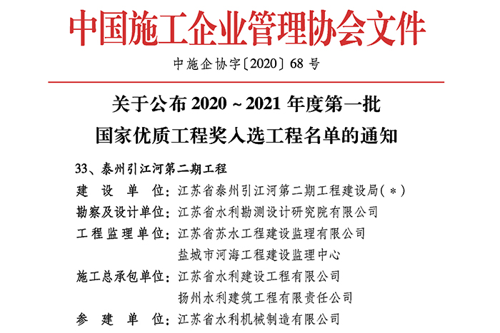 日前,中国施工企业管理协会公布了20202021年度第一批国家优质工程奖获奖名单,我公司承建的泰州引江河第二期工程荣获这一工程建设领域跨行业、跨专业的国家级质量奖。