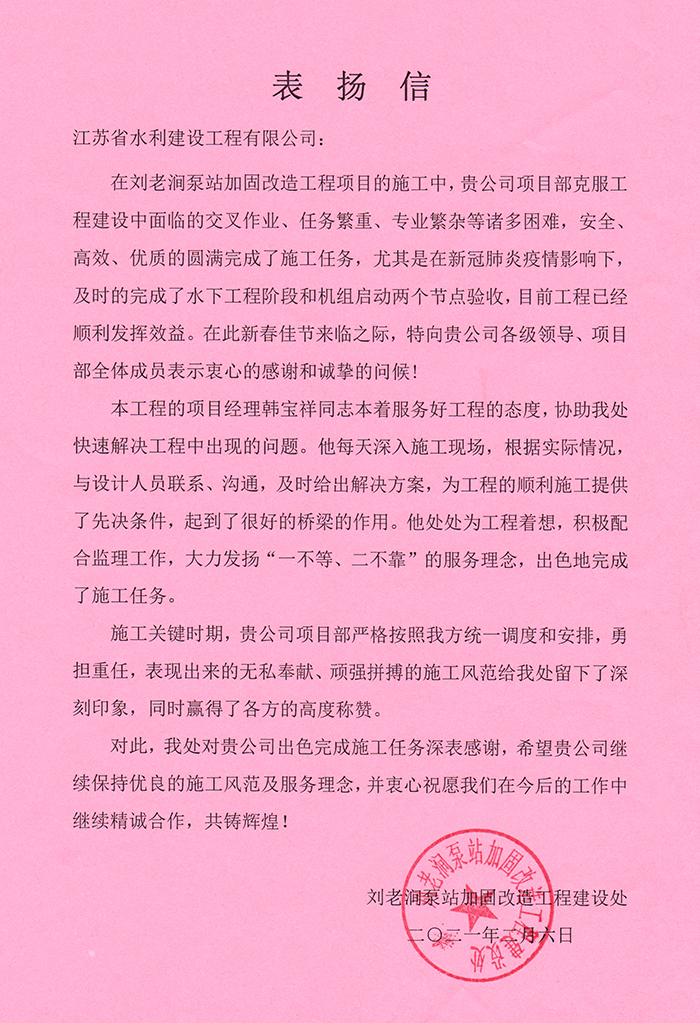 26日,刘老涧泵站加固改造工程建设处发来《表扬信》,对我公司承建的刘老涧泵站加固改造工程圆满完成施工任务给予高度评价,表扬了项目经理韩宝祥同志及项目团队做出的出色成绩,特地向公司表示感谢和祝贺。
