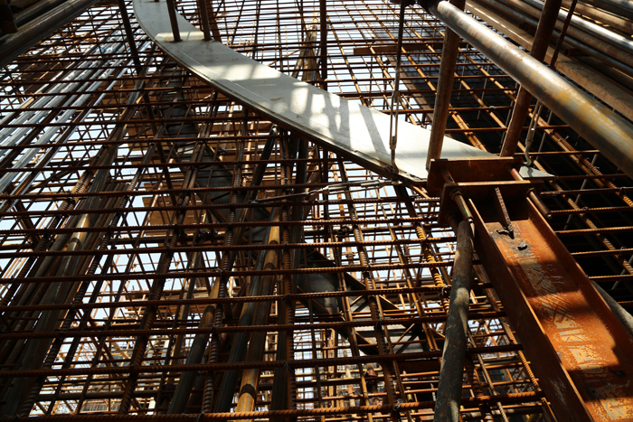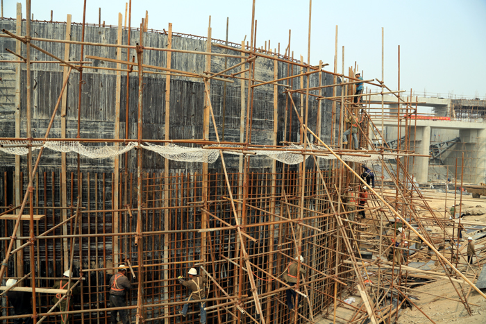 闸墩及交通桥高11.5米,排架及工作桥高17.6米,为典型的高支模脚手架。项目部深知,安全来不得半点差错,时间不允许有返工的现象发生,脚手架必须一步施工到位。现场技术人员进行了认真的策划和计算,不惜代价,设计采用了60×60cm步距的承重脚手,扣件全部采用双顶卡。仅此一项,闸室段就比平时正常施工多用钢管100多吨。稳定牢靠的脚手架,使施工安全和工程质量得到了充分保证。
