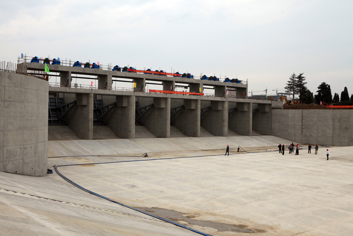 而高达3米的梯形滚水堰施工是工程面临的又一难题。从事施工的人都知道,一个滚水堰就是一个单项工程,一般滚水堰施工往往要花上一个月甚至几个月的时间。泗阳闸7孔就有7个滚水堰,难度之大不难想像。为此,项目部精心制作了样板,对反弧段、斜坡段、正弧段、圆弧段等几个关键部位,都制订了何时立模、如何固定、拆模时间、拆模速度等作业指导方案,精确到每分钟,确保在有效时间内进行原浆收面,保证了混凝土内在质量和外观的流线线条。