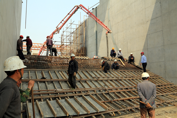 科学的施工调度管理,果断的现场决策,使现场多点作业同步施工,交叉繁忙而井然有序。敬业的管理队伍、熟练的技术工人,保证了施工效率,实现了“人、机、料、法、环”等各个要素的有机融合。施工高峰阶段,每天保持两台以上泵车浇筑混凝土,连续有上百个小时的浇筑强度。在混凝土200多次开仓浇筑中,几乎没有一次是上午进行的,一般都是白天立模晚上浇筑,通宵完成,决不会拖到第二天。以南二联孔(6~7号孔)施工过程为例:2月25日开始立模、扎钢筋、预埋检修门槛,2月26日晚开始浇筑,2天一块底板;3月15日浇筑闸墩及交通桥,期间包括弧形门轨道、双向支铰、检修门槽预埋,用时17天;3月26日完成排架及工作桥浇筑,用时9天。前后历时28天完成了双孔节制闸的全部工作,从5 米高程上升到26.1米,这不能不算是一个奇迹。