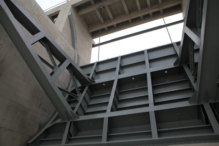 除了大量的人力、物力投入外,超常规的技术措施为工程快速推进发挥了关键作用。闸门双向支铰座、弧形闸门轨道预埋是极易影响工期的一道工序,项目部留给水机公司每联孔预埋的时间只有48小时。要在11.5米高的悬挑脚手上实现精确定位、一次预埋,难度特别大。项目部和水机公司开展了技术攻关,制作了可调节的支撑装置,实现了让下不到底、上不到顶的弧长10多米的弧门轨道按照一点固定,平、侧面可自由调节的预期目标。双角度支铰在图纸上模拟都不容易看清楚。为克服这一难关,施工人员仔细研究推敲,采用厚木板作为底模,底模、木工板、钢板牢固联结,每个支铰的预埋螺栓穿过林立的钢筋网,然后再稳稳地焊接到临时钢板上。最后用模型支铰进行校对,保证模板的刚度和预埋精度。所有埋件实现一次预埋,为后续工程施工节省了大量时间。