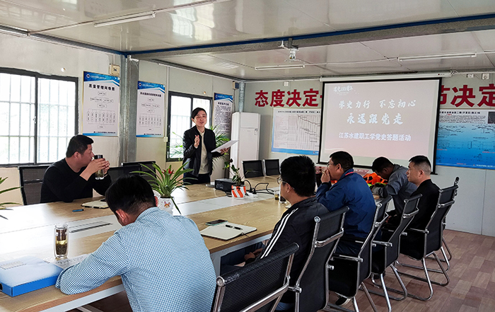 上午,项目部组织劳务人员在党员活动室进行了党史答题活动,分公司工会主席介绍了“上善若水 水利万物而不争”。带领大家学习分享了水利人以自己饱含深情的特质,在水利战线默默地奉献热血和青春,用坚守和刚毅写下了水利的春天。