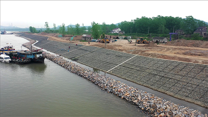 202172日,随着最后一斗块石抛投入水,工程合同内工程量全部优质、高效、安全完成。工程累计完成水下散抛石21万方,赛克格宾石笼1.5万方,浇筑砼6600方,雷诺护垫护坡3500米,铰链排7.2万平方,生态放养鱼苗1080万尾。