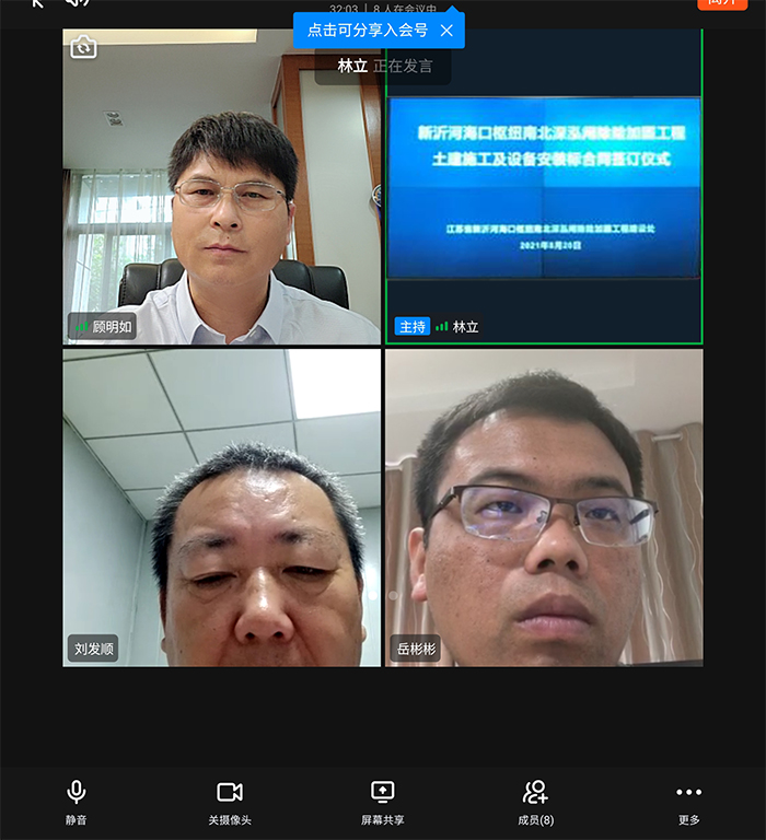 8月20日下午,公司新近中标的新沂河海口枢纽南、北深泓闸除险加固工程通过视频会议的方式举行合同签约仪式。省淮沭新河管理处许永平书记、钱邦永副主任、建设处、监理单位领导和公司董事长顾明如等出席了签约仪式。