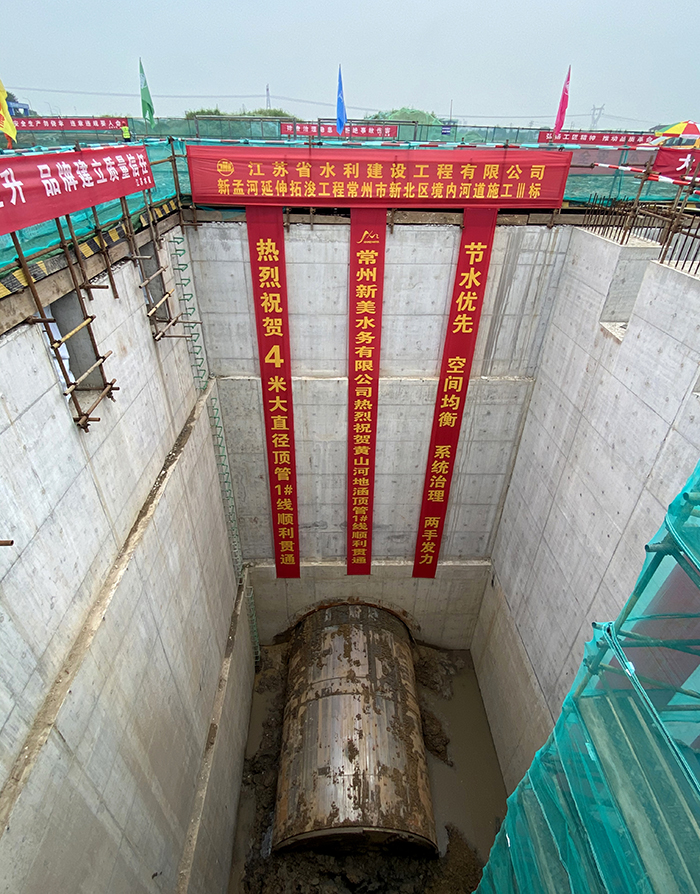 95日上午848分,新孟河延伸拓浚工程常州市新北区河道施工III标黄山河立交地涵4米大直径曲线顶管1#线顺利贯通,省太湖治理工程局、常州市新北区水利局、常州市新美水务有限公司等单位领导、公司杨斌总经理等参加了贯通仪式。