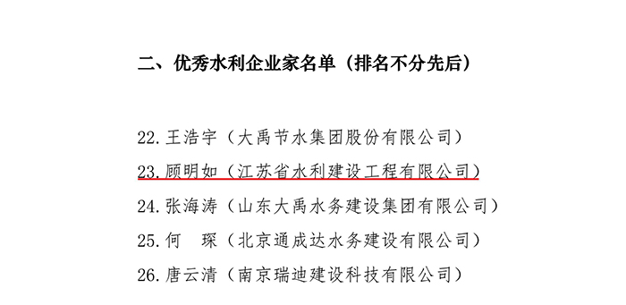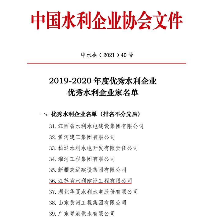 近日,中国水利企业协会公布了2019-2020年度全国优秀水利企业、优秀水利企业家名单,公司再次被授予“优秀水利企业”荣誉称号,顾明如董事长被授予“优秀水利企业家”荣誉称号。